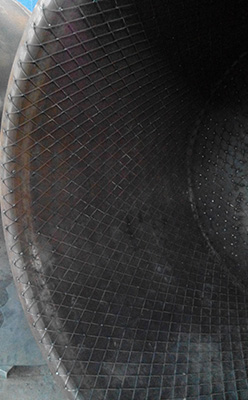 焊接的鋼網龜甲使鋼罐和聚乙烯完美的融合在一起,不脫落。襯塑厚度可達16mm以上。